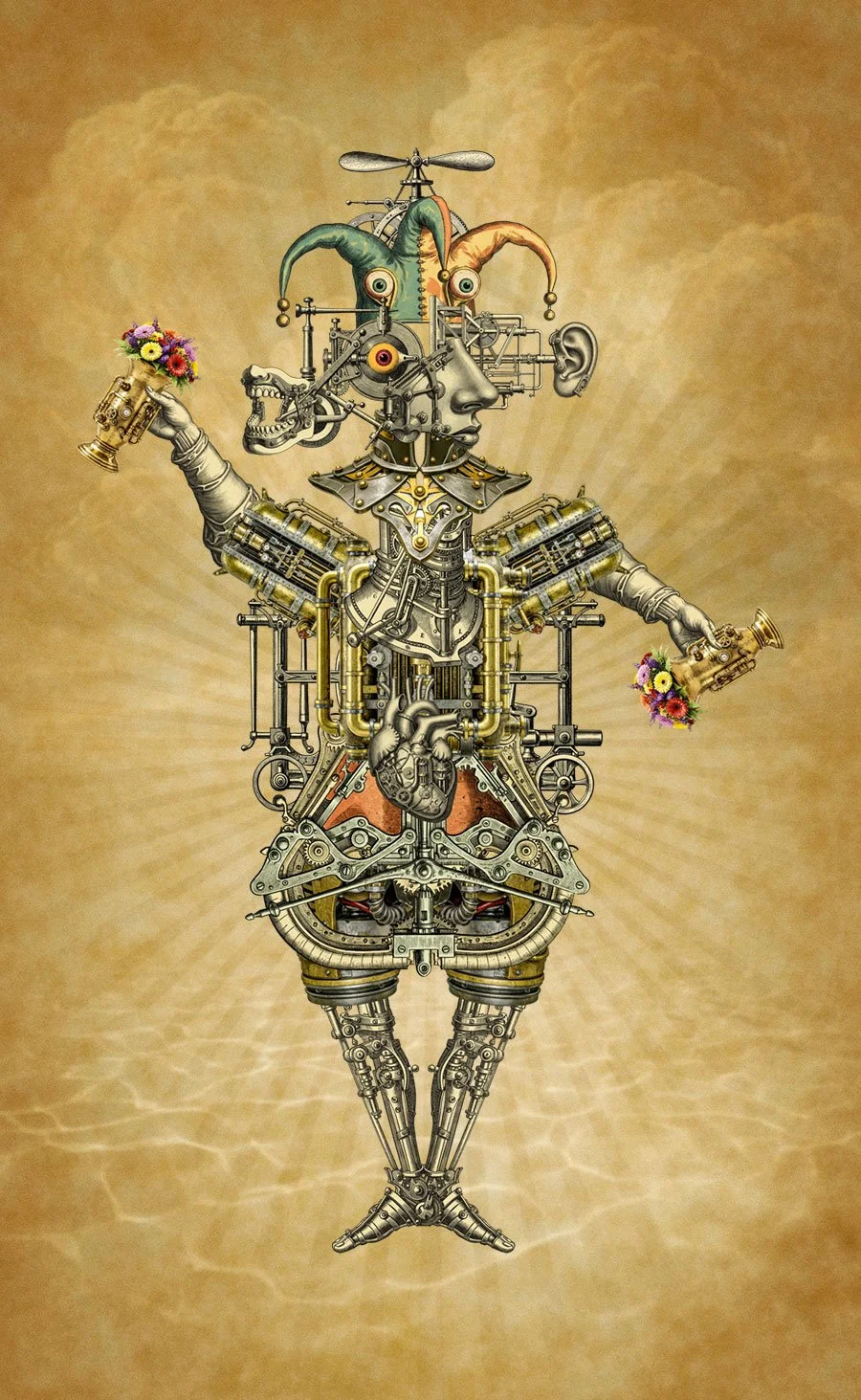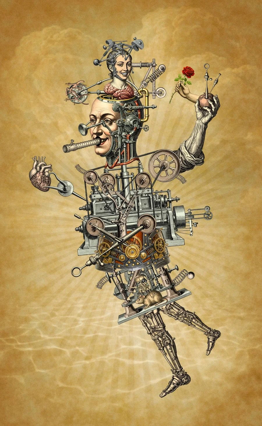 Each scene is a constructed multimedia digital collage of a collection of generated spoof Renaissance paintings, fake Greek and Roman sculptures, and fictional seventeenth-century engravings of medical, industrial, scientific, and technological subjects, and contrived steampunk. AI’s struggle to generate convincing versions of these elements inspired a series of delightfully unhinged combinations, giving the work its charm.